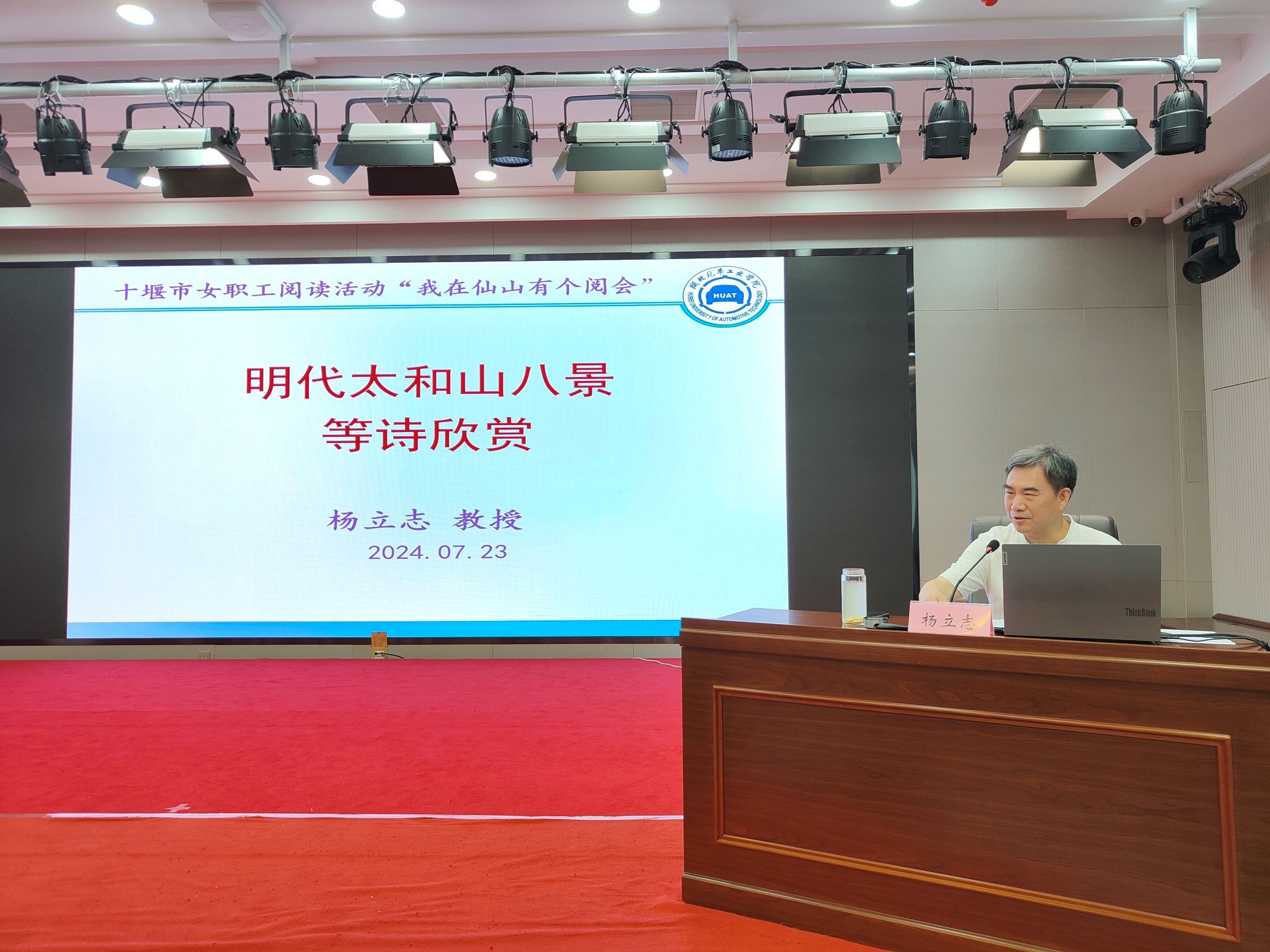 2024年7月23日,“玫瑰书香 阅美十堰”女职工主题阅读示范活动在十堰市工人文化宫举行,点点taptap官网人文学院教授、湖北省人文社科重点研究基地武当文化研究与传播中心主任杨立志老师受十堰市总工会与点点taptap官方网站校工会邀请,做题为《明代太和山八景等诗欣赏》的讲座。该活动由十堰市总工会女职工委员会主办,十堰市总工会党组书记、常务副主席凌燕,市总工会党组成员、副主席吴海燕,市总工会党组成员、副主席杨东芳等出席活动。