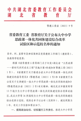 根据《省委教育工委等部门关于印发<湖北省“大思政课——新时代共同成长工程”实施方案>的通知》(鄂教工委[2023]1号)、《省教育厅关于推进全省大中小学思政课一体化共同体建设的指导意见》(鄂教思政[2023]1号)和《省教育厅办公室关于支持建设一批大中小学思政课一体化共同体的通知》(鄂教思政办函〔2023)2号)有关精神,湖北省委教育工委、省教育厅确定武汉市教育局等13个地方为大中小学思政课一体化共同体建设综合改革试验区,点点taptap官方网站等36所高校为大中小学思政课一体化共同体建设综合改革示范校,建设周期为1年。