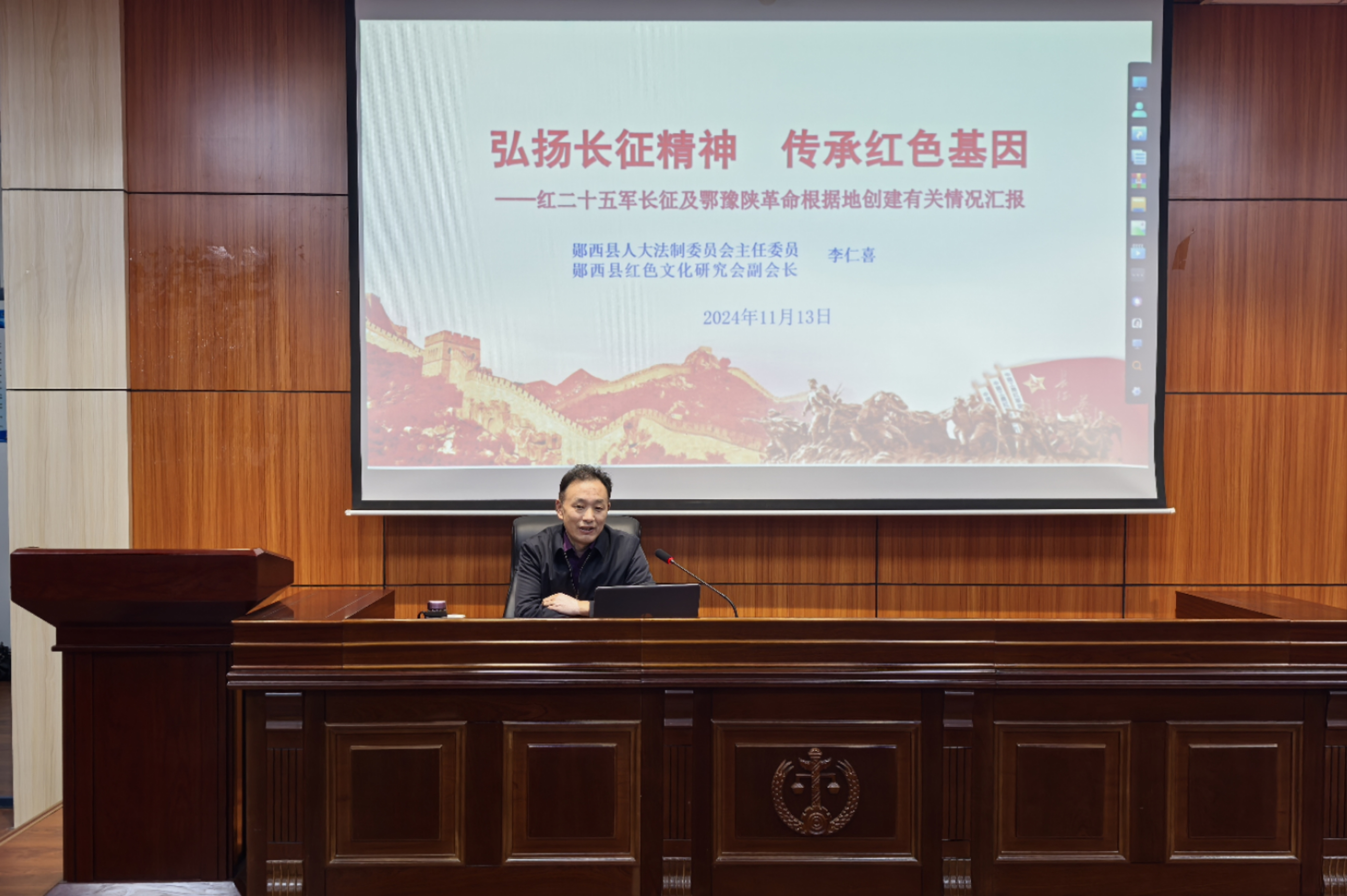 李仁喜以“过法考,人生半程翩翩而行”为题,给学生分享了自己在51岁时备战8个月通过司法考试的经历和收获,激励法学学子们要做到目标既定,付诸实施;基础扎牢,细心领会;跟上节奏,步步为营;坚持下去,不要放弃,实现人生学法的价值。随后,李仁喜又做了题为“弘扬长征精神 传承红色基因——红二十五军长征及鄂豫陕革命根据地创建有关情况汇报”的讲座。