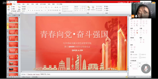 2021年4月29日晚八点,英国上市公司官网365硕士2019级第四党支部依托腾讯会议平台开展了线上党组织生活会。本次会议以“青春向党·奋斗强国”为主题,由邹嘉瑞同志主持,旨在带领大家回顾与学习中国共产党的光辉历程,调动全体党员学习党史的积极性。