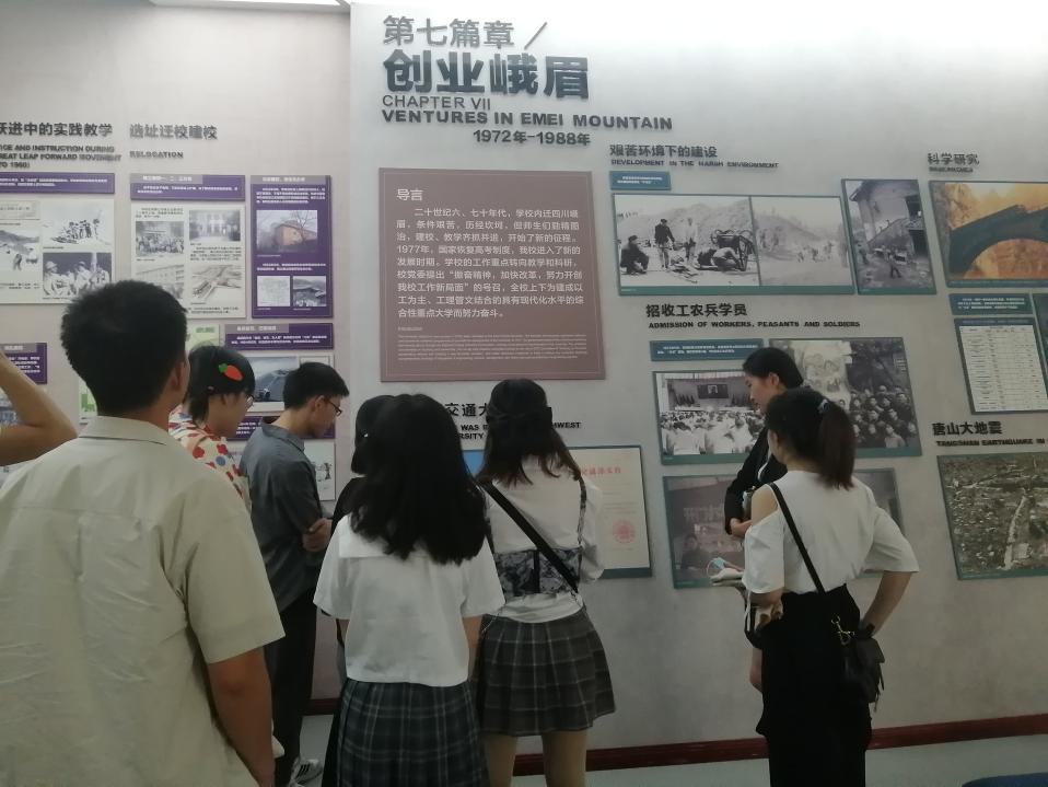 5月27日下午三点,支部成员于犀浦校区建党100周年展前集合,随后大家便一起前往校史馆。英国上市公司官网365校史馆于2016年5月13日正式开馆。校史馆馆名由沈志云院士亲笔题写,全馆面积4200平米,常规展厅里面涵盖了榆关始创、复校唐山、成就斐然、烽火薪传、迎接曙光、砥砺前行、创业峨眉、蓉城新篇等校史沿革8个部分以及办学成果展和杰出校友展。